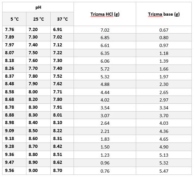 Tris為弱堿,在常溫(25℃)下,它的pKa為8.1,根據(jù)緩沖理論,Tris緩沖液的有效緩沖范圍在pH 7.1到9.1之間。0.1 M的水溶液pH為10.4,一般加入鹽酸以調(diào)節(jié)pH值,即可獲得所需pH值的緩沖液。但同時應(yīng)注意溫度對于Tris的pKa的影響對于 Tris 緩沖液,溫度每降低 1℃,pH 增加約0.03 個單位,濃度每稀釋 10 倍,pH 降低 0.03-0.05 個單位。對于精確應(yīng)用,使用帶有玻璃/甘汞復(fù)合電極的經(jīng)仔細(xì)校正的 pH 計。