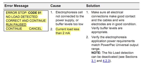 PAGE凝膠電泳期間,電流下降至低于1 mA很常見。有些電泳電源如伯樂電源有負(fù)載檢查功能,電流過低(低于4mA) 會認(rèn)為沒有負(fù)載,報錯E1錯誤代碼,終止電泳。解決方法是更換電泳電源,如使用國產(chǎn)電源;另外可以調(diào)高電壓高于300 V,使得電流不要低于4mA。