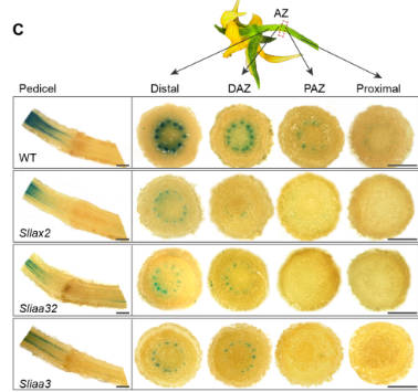 鑒于 SlGATA6 調(diào)控生長(zhǎng)素運(yùn)輸載體 SlLAX2的表達(dá),該研究通過(guò)生長(zhǎng)素特異性抗體的免疫熒光雜交技術(shù)及離區(qū)組織切片分析,在細(xì)胞層面揭示了生長(zhǎng)素的空間分布模式,首次實(shí)現(xiàn)了生長(zhǎng)素梯度的空間維度解析,證實(shí)了 SlGATA6 是維持這一梯度的關(guān)鍵。通過(guò)免疫熒光雙標(biāo)試驗(yàn)發(fā)現(xiàn),SlIAA3 與 SlIAA32 蛋白信號(hào)強(qiáng)度在遠(yuǎn)軸端到近軸端方向呈現(xiàn)相反的分布規(guī)律,即遠(yuǎn)軸端 SlIAA32 信號(hào)強(qiáng),SlIAA3 信號(hào)弱,近軸端則反之。值得注意的是,SlIAA32 和 SlIAA3 的總信號(hào)強(qiáng)度由遠(yuǎn)軸端到近軸端顯著減弱,形成了離區(qū)生長(zhǎng)素的信號(hào)梯度。由于 SlIAA32 和 SlIAA3 均可以提高生長(zhǎng)素信號(hào),且破壞 SlIAA32 和 SlIAA3 的功能都能夠?qū)е律L(zhǎng)素信號(hào)嚴(yán)重受損,表明 SlIAA32 和 SlIAA3 是建立生長(zhǎng)素響應(yīng)梯度的關(guān)鍵因子。