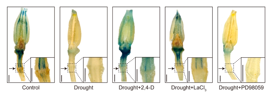 該研究發(fā)現(xiàn),干旱脅迫下SlCBL11/SlCIPK10-SlLHP1b信號(hào)模塊誘導(dǎo)番茄落花的作用機(jī)制。干旱脅迫激活SlCBL11-SlCIPK10鈣離子感受器模塊,磷酸化修飾SlLHP1b。磷酸化的SlLHP1b通過H3K27me3依賴的方式結(jié)合下游生長(zhǎng)素合成基因SlYUCs的啟動(dòng)子區(qū)域抑制其表達(dá),導(dǎo)致雄蕊中生長(zhǎng)素合成減少,破壞離區(qū)生長(zhǎng)素梯度,誘發(fā)番茄落花。該研究揭示了干旱下鈣信號(hào)通過表觀遺傳調(diào)控生長(zhǎng)素合成參與番茄落花的分子機(jī)制,進(jìn)一步完善了植物逆境響應(yīng)中鈣信號(hào)與表觀遺傳調(diào)控的分子網(wǎng)絡(luò),還為培育耐旱、高產(chǎn)的品種提供了潛在的基因靶點(diǎn)。研究成果對(duì)提高逆境下的番茄產(chǎn)量,提高經(jīng)濟(jì)效益具有重要的指導(dǎo)意義。該研究獲國(guó)家重點(diǎn)研發(fā)計(jì)劃項(xiàng)目、國(guó)家自然科學(xué)基金面上項(xiàng)目和青年科學(xué)基金等項(xiàng)目支持。