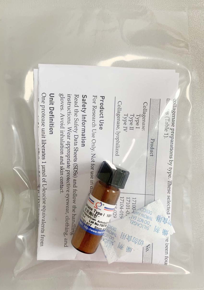 說明:Prepared from Clostridium histolyticum for dissociation of tissues. Type I contains average amounts of assayed activities-collagenase, caseinase, clostripain and trypsin. Suggested for epithelial, lung, fat (adipocytes), hepatocytes and adrenal tissue cell preparations.