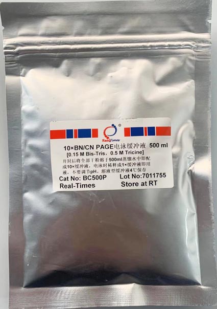 將10×BN/CN PAGE電泳緩沖液(干粉)溶于500 ml滅菌水中,徹底溶解,測定pH應為7.0左右,不要調(diào)節(jié)pH。用前稀釋10倍即配成1×BN/CN PAGE電泳緩沖液。