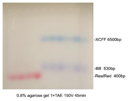 6×RealRed DNA上樣緩沖液(6×RealRed DNA loading buffer)是一種經(jīng)過改良的六倍濃縮的DNA上樣緩沖液。常規(guī)的以溴酚藍(lán)為指示劑的DNA緩沖液,由于溴酚藍(lán)的電泳的位置與200-500 bp的DNA的電泳位置相近,在EB染色觀察200-500bpDNA時,溴酚藍(lán)對這些DNA片段的觀察有很強的干擾。特別是當(dāng)這些小片段的量較少時,溴酚藍(lán)甚至?xí)研∑蜠NA的信號全部遮蓋掉。而該上樣緩沖液紅色指示前沿的電泳位置相當(dāng)于100-200 bp的DNA片段。這樣就可以基本消除染料對小片段DNA觀察時的干擾。另外,6×RealRed