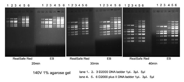 2.1 用制備凝膠電泳對應的1×電泳緩沖液將RealSafe Red稀釋約5000倍,制成即用型染色溶液。(例如:將20 μl RealSafe Red加入到100 ml 緩沖液中)。