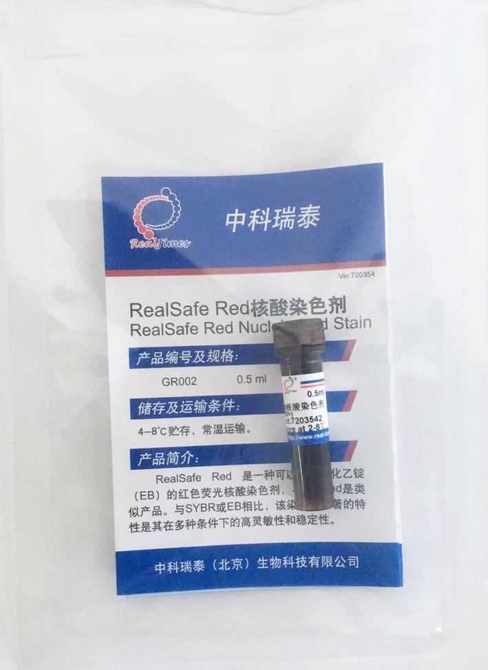 RealSafe Red?是一種可以替代溴化乙錠(EB)的紅色熒光核酸染色劑,與GelRed是類似產(chǎn)品。與SYBR或EB相比,RealSafe Red最顯著的特性是其在多種條件下的高靈敏性和穩(wěn)定性。另外相對EB或SYBR,RealSafe Red誘導突變的能力極低。