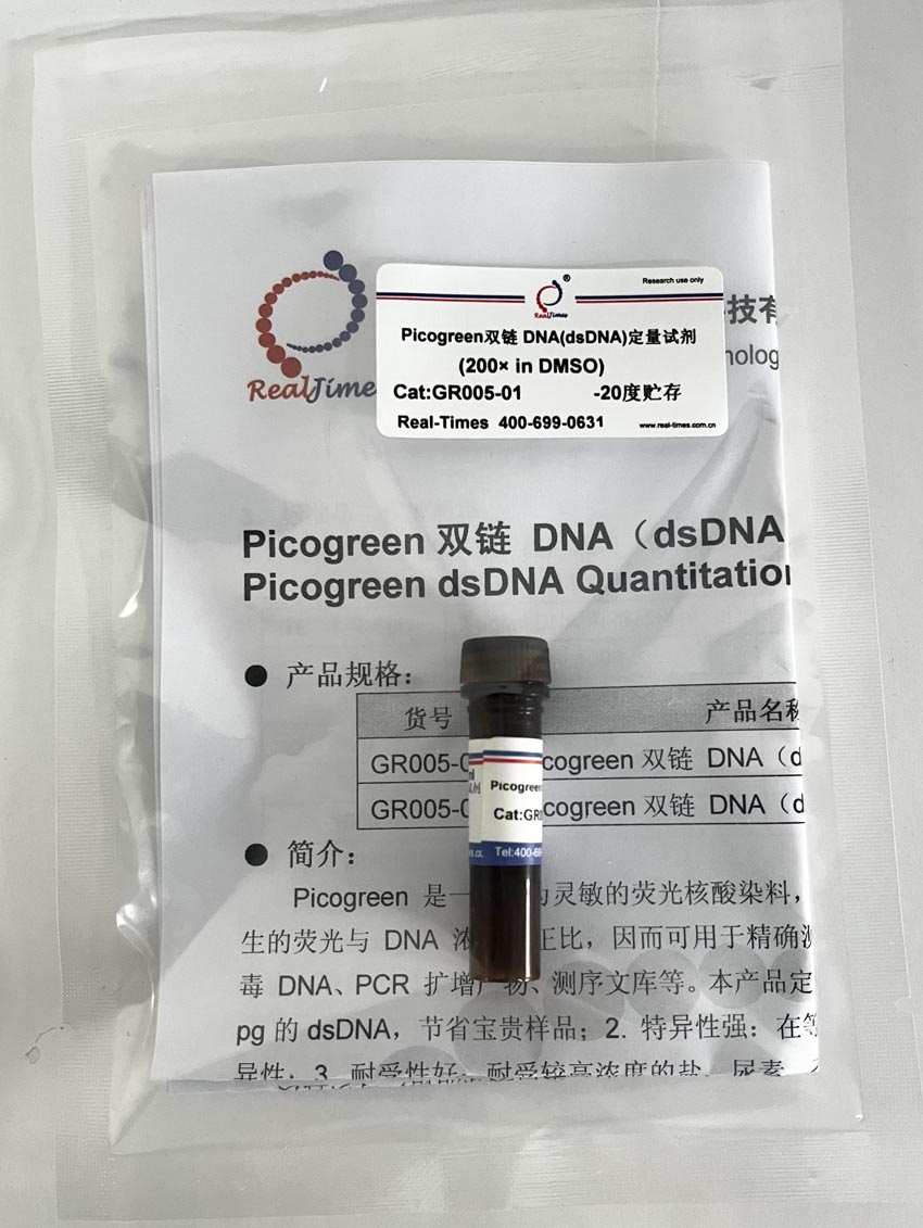 Picogreen 是一種極為靈敏的熒光核酸染料,其僅在與DNA 雙鏈結(jié)合后才發(fā)出熒光,且所產(chǎn)生的熒光與 DNA 濃度呈正比,因而可用于精確測(cè)量多個(gè)來(lái)源的 dsDNA,包括基因組 DNA、病毒 DNA、PCR 擴(kuò)增產(chǎn)物、測(cè)序文庫(kù)等。本產(chǎn)品定量具有以下優(yōu)勢(shì):1. 靈敏度高:可檢測(cè)低至200 pg的dsDNA,節(jié)省寶貴樣品;2. 特異性強(qiáng):在等摩爾的RNA存在的條件下,對(duì)dsDNA具有特異性;3. 耐受性好:耐受較高濃度的鹽、尿素、乙醇、氯仿、去垢劑、蛋白或瓊脂糖,可以直接定量PCR擴(kuò)增產(chǎn)物而無(wú)需從反應(yīng)混合物中純化DNA。4. 易于使用-只需在樣品中加入染料,等待5分鐘,然后讀數(shù)即可,且適用于96和384孔板;與大多數(shù)基于熒光的酶標(biāo)儀和熒光計(jì)兼容。5. 適用范圍廣:可適用于PCR的分析、芯片樣品、DNA損傷分析、酶活分析、基因組DNA定量以及復(fù)雜混合物中dsDNA的檢測(cè)和病毒DNA定量等多種領(lǐng)域。