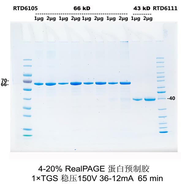 本產品包含一種已知分子量的標準蛋白質,分子量大小為43 kD,可以用來判斷 SDS-PAGE未知蛋白的分子量。43 kD單條蛋白以干粉狀態(tài)提供。