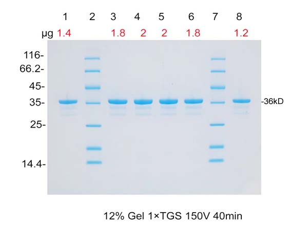 本產(chǎn)品包含一種已知分子量的標(biāo)準(zhǔn)蛋白質(zhì),分子量大小為36 kD,可以用來判斷 SDS-PAGE未知蛋白的分子量。36 kD單條蛋白Marker 以干粉狀態(tài)提供。配制好的Marker適用于變性還原電泳,不適用于非變性電泳(Native Electrophorosis)。