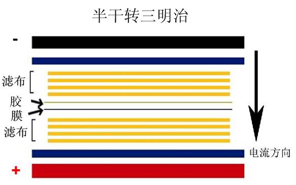 5.1 排列順序(圖一):1 負(fù)極(陰極)-2一張超厚濾紙或四層濾布-3 凝膠-4 轉(zhuǎn)印膜-5一張超厚濾紙或四層濾布-6 正極(陽極)