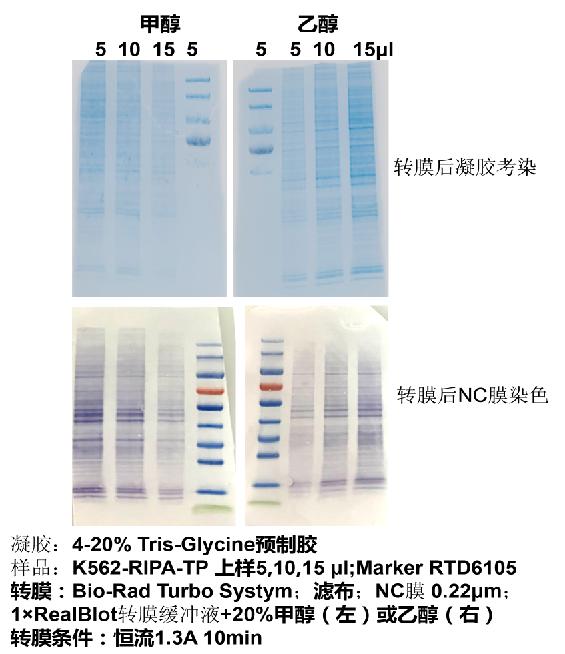 A2:可以使用甲醇代替乙醇,并且使用甲醇配制的轉(zhuǎn)膜緩沖液轉(zhuǎn)膜效率要高于乙醇(圖三)。然而,考慮到甲醇的毒性和環(huán)境的不友好,請(qǐng)謹(jǐn)慎選擇是否使用。