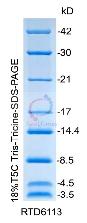 本產品包含8種低分子量蛋白質,分子量范圍為3.5-42 kD,通過 Tris-Tricine-SDS-PAGE電泳并經(jīng)考馬斯亮藍染色后可見分子量大小為3.5,4.5,8.5,14.4,17,21,30,42