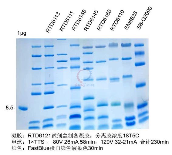 凝膠也可以使用常規(guī)考馬斯亮藍染色液(配方7)和脫色液(配方8)進行染色和觀察。需要注意的是,常規(guī)染色和脫色方法需要較長時間,小肽由于長度較短,和凝膠結合不緊密,長時間在溶液中浸泡容易從凝膠中脫離。FastBlue蛋白染色液(貨號:RTD6202)除具有染色快,無毒,靈敏性高等特點外,還能對小肽在染色中起到固定作用,不至于小肽在染色和脫色中從凝膠中脫離,是常規(guī)染色液的理想替代品。