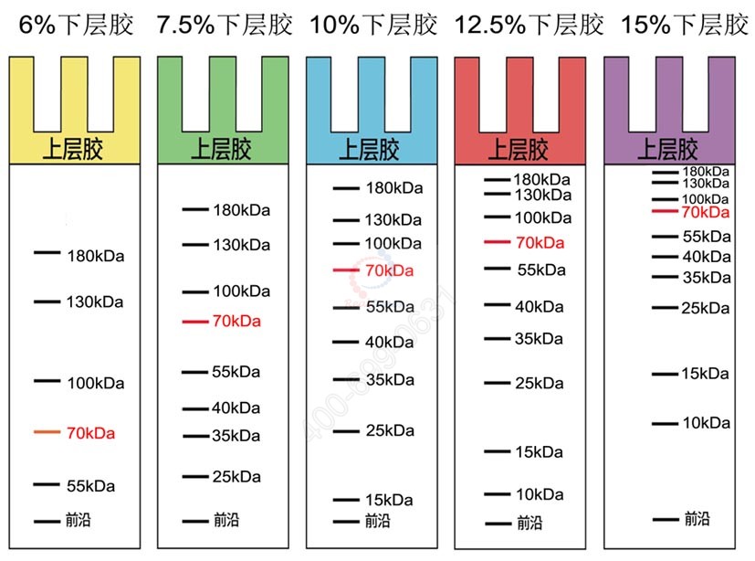 上圖為 Tris-甘氨酸緩沖系統(tǒng)中,蛋白分子量標準 (10-180 kDa,含有 10 條蛋白條帶 ) 在不同濃度的 SDS-PAGE凝膠中的分離示意圖。因溫度、pH 值等因素不同,實際分離情況會略有出入,本圖僅供參考。