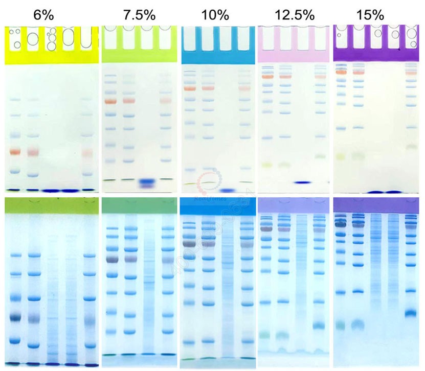 該產(chǎn)品利用聚丙烯酰胺凝膠電泳原理,采用上層膠和下層膠的預混配方,只需加入改良型促凝劑,可在15-30分鐘內(nèi)配制得到高質(zhì)量的聚丙烯酰胺凝膠,可用于變性和非變性蛋白凝膠電泳,適用于Tris-甘氨酸電泳體系(Laemmli體系)。本產(chǎn)品可以配制6%(黃色上層膠)、7.5%(綠色上層膠)、10%(藍色上層膠)、12.5%(紅色上層膠)和15%(紫色上層膠)的分離膠濃度,所配的上層膠帶有顏色 (黃色、綠色、藍色、紅色或紫色 ),點樣孔清晰易辨,方便點樣,可以滿足絕大多數(shù)蛋白電泳需求。