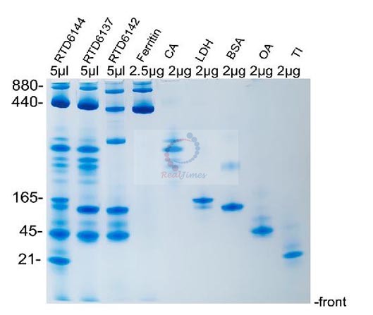特別說明:由于本系統(tǒng)采用非連續(xù)Laemmli凝膠系統(tǒng)(Tris-Glycine系統(tǒng)),電泳凝膠系統(tǒng)pH在8.3-8.8,因此要求待分離的蛋白等電點(diǎn)pI≤8.0(酸性蛋白),這樣蛋白在凝膠系統(tǒng)內(nèi)帶負(fù)電荷,pI越低于8.0,帶更多的負(fù)電荷,在凝膠電泳中才能正常向正極泳動(dòng)。如果待分離的蛋白等電點(diǎn)pI>8.0(堿性蛋白),請(qǐng)選擇堿性電泳凝膠系統(tǒng)分離(貨號(hào)RTD6131)。