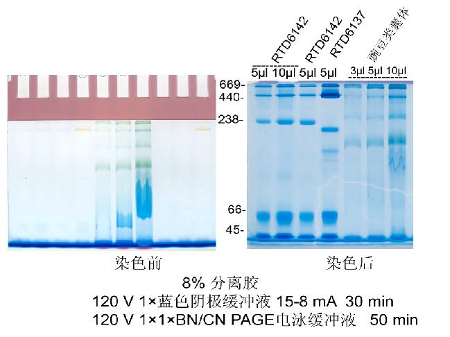 Blue/Clear Native PAGE(BN/CN-PAGE)是一種從生物樣品(質(zhì)膜,胞漿等)中分離分子量10 kD-10 M kD 范圍的蛋白質(zhì)復(fù)合物的電泳技術(shù)。其原理是用溫和去污劑(如 DDM,digitonin)將蛋白復(fù)合體從細(xì)胞膜中以近似天然的狀態(tài)分離出來(lái),Blue Native PAGE (BN-PAGE)是用考馬斯亮藍(lán) G-250 代替 SDS與蛋白結(jié)合而使其帶負(fù)電荷,根據(jù)蛋白分子量不同在 PAGE膠中得到分離;Clear Native PAGE(CN-PAGE)是電泳緩沖液中不加入任何染料,電泳中始終保持蛋白的天然電荷和活性狀態(tài),然而,其蛋白的分辨率要低于Blue Native PAGE。另外,BN-PAGE由于考馬斯亮藍(lán)G-250存在,使蛋白都覆蓋上負(fù)電荷,可以分離堿性蛋白(pI>7)和酸性蛋白(pI<7);而CN-PAGE只適合于酸性蛋白(pI<7)的分離。