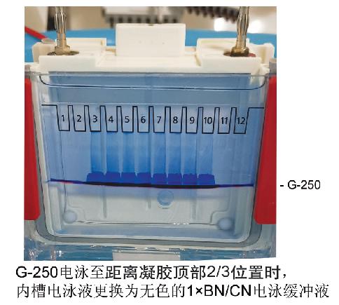 更換為無(wú)色1×BN/CN PAGE電泳緩沖液,電泳時(shí)間共83分鐘