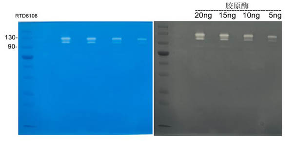 實(shí)驗(yàn)結(jié)果:膠原酶消化明膠底物,在70-130 kD區(qū)間產(chǎn)生明亮條帶。