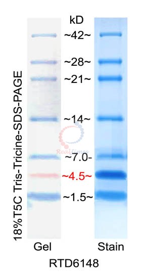 kD為紅色,其余條帶為藍色條帶,分子量大小為 ~1.5 kD,~4.5 kD(紅色),~7 kD, ~14 kD,~21 kD, ~28 kD,~42 kD??梢杂糜谥苯佑^察蛋白質(zhì)電泳狀況以及清晰地判斷Western Blot的轉(zhuǎn)膜效果。經(jīng)Tricine-甘油SDS-PAGE凝膠電泳時以及轉(zhuǎn)移到PVDF或NC膜上可看到清晰的7條顏色條帶。