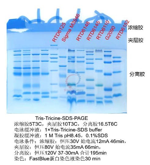 (含預染Marker)(貨號:RTD6121)或Tris-Tricine-PAGE凝膠制備及電泳試劑盒(多肽變性電泳)(貨號:RTD6122)進行Tricine電泳,方便快捷。或者根據(jù)以下程序制備凝膠,先配制分離