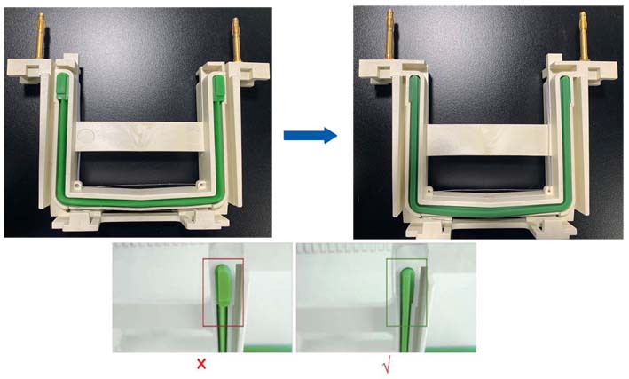 注:伯樂Mini III或Mini-PROTEAN Tetra Cell,天能VE-180,六一24K系列電泳槽請確保密封條的安裝方向(如圖)。