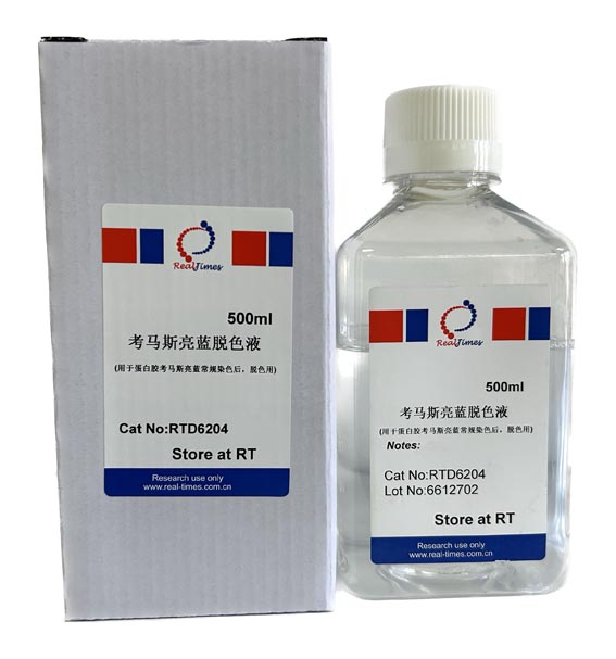 Blue Staining Destaining Solution)是用于蛋白凝膠考馬斯亮藍染色后凝膠的脫色。本脫色液可以和考馬斯亮藍染色液(RTD6203)配套使用。使用本脫色液進行脫色,采用常規(guī)脫色方法至少脫色1小時可以觀察到蛋白條帶;采用快速脫色方法不足20分鐘即可觀察到蛋白條帶。觀察到最清晰的蛋白條帶則需脫色更長時間。