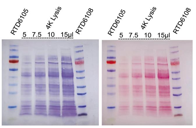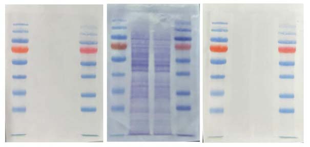 該產(chǎn)品可以解決其他印跡膜染色方法的缺點。例如,麗春紅染色靈敏度低(特別是PVDF膜,蛋白的檢測下限是250 ng),膜上紅色容易褪色,紅色條帶不易拍照等。經(jīng)典的考馬斯染料是雖具有靈敏度高的優(yōu)點,但它永久與蛋白質(zhì)結合,不易洗脫掉染料,干擾后續(xù)的Western blotting實驗。