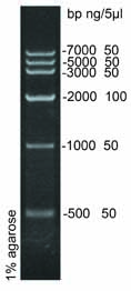 本產(chǎn)品是由6條精準(zhǔn)定量的帶狀雙鏈DNA條帶組成,適用于瓊脂糖凝膠電泳中DNA條帶的定量分析。產(chǎn)品中已含有1×loading buffer,可根據(jù)實(shí)驗(yàn)需要,直接取2-5μl電泳,使用方便,電泳圖像清晰。6條帶的大小分別為500bp1000bp,1500bp,3000bp5000bp,8000bp,其中3000bp條帶最亮,含量為100ng/5μl,其余條帶濃度為50ng/5μl。