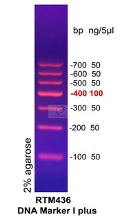 本產(chǎn)品是由7條帶狀雙鏈DNA條帶組成,適用于瓊脂糖凝膠電泳中DNA條帶的分析。產(chǎn)品中已含有1×loading buffer,可根據(jù)實(shí)驗(yàn)需要,直接取2-5 μl電泳,使用方便,電泳圖像清晰。7條帶的大小和含量分別為100(50 ng/5 μl),200(50 ng/μl),300(50 ng/μl),400100 ng/μl,500(50 ng/μl),600(50 ng/μl),700(50 ng/μl)bp。其中400bp條帶加亮顯示。