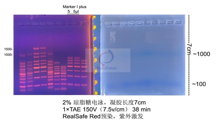 4. 推薦使用RealSafe系列染料(貨號(hào):GR002,GR003,GR004)染色。如果使用Goldview或EB等染料進(jìn)行染色,由于此類染料帶更多的正電荷(染料移動(dòng)方向與核酸泳動(dòng)方向相反),隨著電泳時(shí)間延長(zhǎng),染料向大片段聚集,凝膠會(huì)出現(xiàn)陰陽膠現(xiàn)象(染料含量高的凝膠紫外下較亮,含量低的凝膠紫外下發(fā)暗),導(dǎo)致小分子量DNA顯色很弱或不可見。陰陽膠可以在電泳結(jié)束后浸泡染色,將膠浸沒在含1 μg /ml EB或Goldview的電泳緩沖液中20-25 min,小分子量DNA會(huì)顯色清楚。更長(zhǎng)時(shí)間浸泡會(huì)因DNA分子擴(kuò)散而使條帶彌散,小分子量DNA更易彌散。