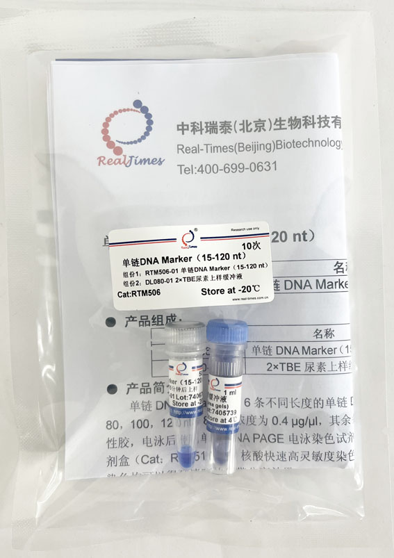 單鏈DNA Marker由6條不同長(zhǎng)度的單鏈DNA分子混合而成,6條帶的大小為15,40,60,80,100,120 nt,80 nt 濃度為0.4 μg/μl,其余條帶濃度為0.2
