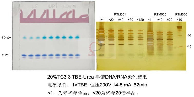用單鏈DNA PAGE電泳染色試劑盒(Cat:RTS5103),核酸PAGE電泳染色試劑盒(Cat:RTS5102)或核酸快速銀染試劑盒(Cat:RTS5101)染色均可以得到清晰的條帶分離效果。