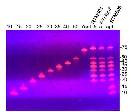 Marker樣品(不用添加上樣緩沖液);待測樣品與等體積的2×TBE尿素上樣緩沖液(Cat:DL080-01)混合,70℃處理5分鐘,冰浴制冷后待上樣。