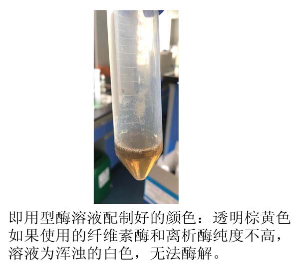 溶解好的正常酶溶液應為澄清棕黃色溶液,如使用純度不好的酶,溶液為不溶解的乳白色懸濁液,不能使用。