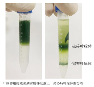 1.6.2.4 4℃ 3200 g離心15分鐘,上層綠色帶含破碎的葉綠體、線粒體和核糖體等,重液和輕液間的綠色帶為完整葉綠體(右圖)。