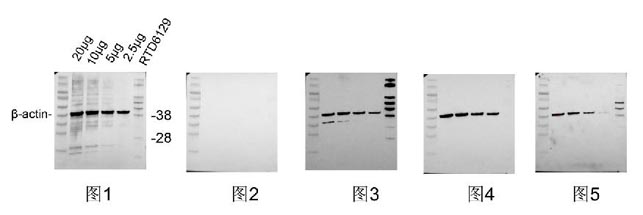 圖3:5%脫脂奶粉封閉液(貨號(hào):WN1070),常溫?fù)u床60分鐘,PCNA 1:5000(貨號(hào):APM5012)  RT 60min,羊抗鼠IgG-HRP 1:5000 (貨號(hào):HGM1060)RT 60min,自動(dòng)曝光11秒,β-actin和PCNA同時(shí)有條帶,說明圖二中actin一抗沒有完全去除干凈。